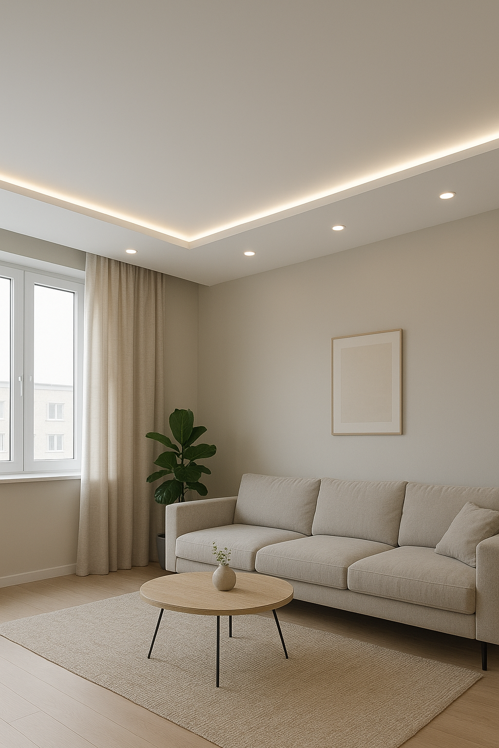 Натяжні полотна чудово взаємодіють із підсвіткою: можна реалізувати ефект “парящої” стелі, контурне світло або приховану LED-підсвітку. Завдяки цьому простір стає візуально більшим, а вечорами — атмосферним і затишним.