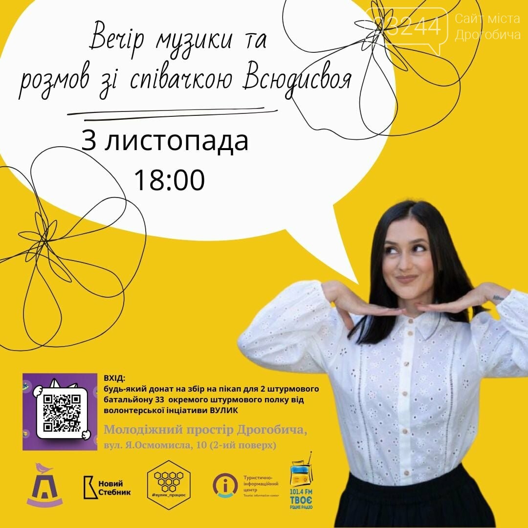 Молодіжний простір, у співпраці з Туристично-інформаційним центром Дрогобича, організовує вечір розмов та музики зі співачкою Всюдисвоя.