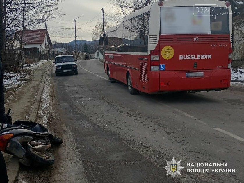 У Бориславі внаслідок зіткнення з автобусом травмований неповнолітній пасажир мопеда – поліцейські встановлюють обставини події
